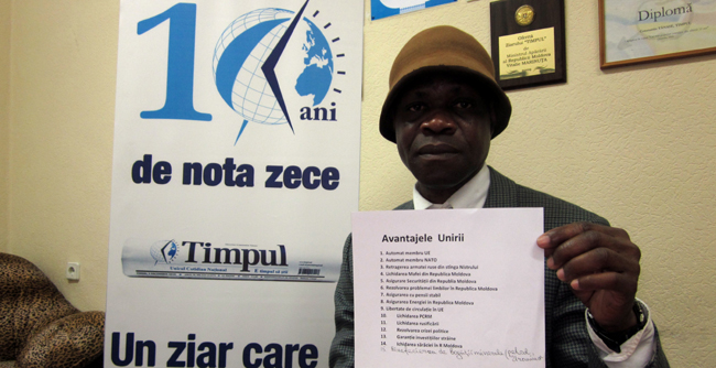 – Mă numesc John Onoje. Am aproape 14 ani de când locuiesc în R. Moldova. Am ajuns aici ca refugiat din Siera Leone, o ţară africană, unde era război civil. În 2001 am primit statutul de refugiat. Am stat mai mulţi ani fără serviciu. În 2004 am avut probleme cu locul de trai, dar şi cu de-ale gurii. Am mers la Înaltul Comisariat pentru Refugiaţi şi mi-am cerut drepturile de identitate şi document de călătorie. O doamnă de acolo, o japoneză, mi-a spus să îmi fac documente că sunt refugiat, ca să-mi pot găsi un loc de muncă.