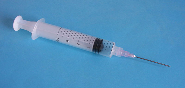 În toate aceste cazuri însă a fost imposibilă injectarea preparatelor fără o incizie, până când medicul irlandez, Francis Rynd, a inventat acul cu gaură în 1844. Astfel, din dorinţa de a injecta fier perchlorid coagulant într-un anevrism, Pravaz a adaptat acul lui Rynd, însă fără a folosi, ca de obicei, metoda de aspirare. Măsurând 3 cm în lungime şi 5 mm în diametru, seringa era în întregime de argint, realizată de Etablissements Charrière, şi era operată de un şurub (mai degrabă decât pistonul familiar azi), pentru a controla cantitatea de substanţă injectată.