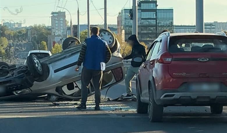 Accident violent pe un pod din Capitală. O mașină s-a răsturnat