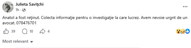 Anunțul privind reținerea lui Anatol Mătăsaru a fost făcut de jurnalista de investigație Julieta Savițchi: „Anatol a fost reţinut. Colecta informaţie pentru o investigaţie la care lucrez. Avem nevoie urgent de un avocat”.