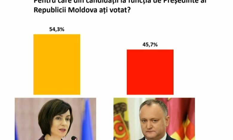 Acasă/Actualitate/AFTER-POLL pentru ora 21:00 (fără diasporă și cei din stânga Nistrului) / Maia Sandu – 54.3%. Igor Dodon – 45,7% Actualitate AFTER-POLL pentru ora 21:00 (fără diasporă și cei din stânga Nistrului) / Maia Sandu – 54.3%. Igor Dodon – 45,7% Timpul.md15 noiembrie 20200 0 Copy URL URL Copied Timpul.md15 noiembrie 20200 0 Facebook X Odnoklassniki Messenger Messenger WhatsApp Telegram Distribuie prin mail Tipărește