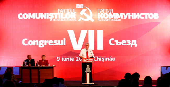 Cel de-al VII-lea Congres al PCRM s-a desfăşurat sâmbătă la centrul expoziţional Moldexpo, nu departe de monumentul lui Lenin. De fapt, delegaţii au început evenimentul cu depunerea florilor pe soclul de granit al conducătorului tuturor proletarilor, iar apoi au mers în coloană către pavilionul nr.2. Congresul a început cu intonarea imnului R. Moldova şi un minut de reculegere în memoria comuniştilor trecuţi în nefiinţă. La mesele amenajate într-o sală imensă dotată cu leduri şi monitoare au luat loc peste 450 de invitaţi, membri ai PCRM din localităţile republicii. Printre oaspeţi au fost reprezentanţi ai partidelor comuniste din regiunea transnistreană, Rusia, Belarus, România şi Bruxelles (Stânga Europeană). În primele două ore ale Congresului, liderul PCRM Vladimir Voronin şi-a citit discursul trecând în revistă schimbările politice care s-au întâmplat în ţară. Voronin a calificat regimul de la guvernare drept unul „criminal”, partidele din Alianţă „asasini ai independenţei”, iar alegerea preşedintelui R. Moldova de pe 16 martie drept „o farsă”.