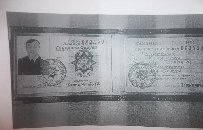 de la vama Palanca la 31 ianuarie 2014. Echipa era condusă de Kim Koshev născut 1934 , ofiţer in rezerva Serviciului de Informaţii Externe a Federaţiei Ruse, posesorul legitimației nr. 2321, vezi foto 1, 2. În pline acțiuni de organizare a referendumului gagauzesc, în raionul Taraclia la 1 februarie 2014 a fost surprins colonelul cazacilor din Federația Rusă, Cuiuzuclu Vasilii Petrovici născut 1960, posesorul legitimației nr. 063150 cu inscripția ”Казачество россии”, ”заместитель генерала округа”, vezi foto mai jos: