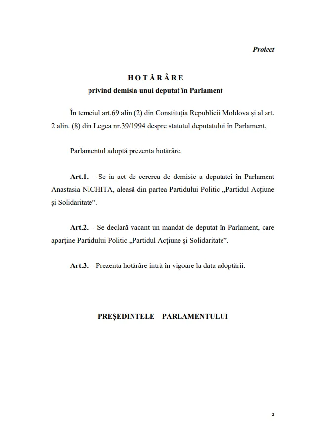 Anastasia Nichita a depus oficial cererea de demisie din funcția de parlamentar, documentul fiind înregistrat la începutul lunii februarie. Ulterior, Parlamentul Republicii Moldova a inițiat procedurile pentru constatarea vacanței mandatului de deputat pe lista Partidului Acțiune și Solidaritate.
