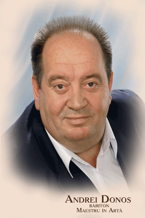 Acesta este bravul nostru bariton Andrei Donos! In anii de glorie ai teatrului a realizat un sir de roluri de o frumusete rara: Rigoletto din opera cu acelasi nume de Verdi, contele Di Luna din opera „Trubadur”, Renato din „Bal mascat”, Jermont din „Traviata”, Melitone din „Forta destinului”, Figaro din „Barbierul din Sevilia” de P. Rossini, Ponia din „Paiate” de Leoncovalo, Silvio din aceeasi opera, Sharples din „Madame Butterfly” de Puccini si multe alte roluri de valoare. Are mai multe calitati frumoase, printre care si… cei sapte ani de acasa. Este un mare gospodar, un sot bun si tata a doi copii. Dar este si un om de incredere – nu se vinde si nu-si vinde prietenii.