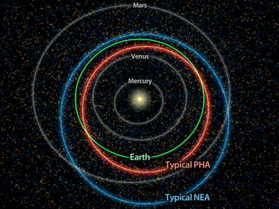 Notă: Cu roşu sunt reprezentaţi asteroizii periculoşi pentur Pământ. Cu albastru sunt reprezentaţi asteroizii obişnuiţi, a căror traiectorie nu ameninţă Pământul (Foto: NASA)
