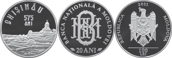 Una dintre aceste monede este consacrată celei de-a 20-a aniversări de la adoptarea Constituţiei Republicii Moldova şi are valoarea nominală de 100 de lei, greutatea de 13 grame, diametrul de 28 de milimetri, forma rotundă şi este emisă într-un tiraj de o mie de exemplare.