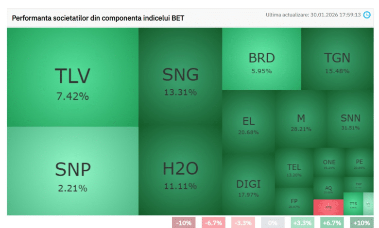 DIGI a urcat cu aproape 18% în ianuarie, TeraPlast (TRP) cu 16%, Transgaz (TGN) cu 15,5% – acţiune care cumulează un avans de peste 200% în ultimele 12 luni – iar One United (ONE) cu 15%. Romgaz (SNG) a adăugat 13%, Transelectrica (TEL) 13%, iar Hidroelectrica (H2O), a crescut cu 11% în ianuarie. Băncile au avut o evoluţie mai temperată: Banca Transilvania (TLV) +7,4% şi BRD +6%, în timp ce OMV Petrom (SNP) a urcat cu 2,2%. La polul opus, câteva titluri au stagnat sau au scăzut uşor, precum Sphera, Purcari sau Antibiotice.