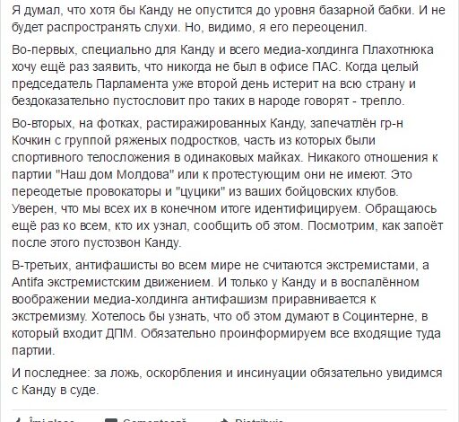 După declarațiile lui Andrian Candu precum că Maia Sandu s-ar fi întâlnit cu Grigore Petrenco la sediul PAS, iar ulterior cel din urmă a trimis tineri îmbrăcați în tricouri care conțineau simboluri ale F. Ruse pentru a participa la protest, și lidera PAS a scris că-l va ataca în judecată pe președintele Parlamentului.