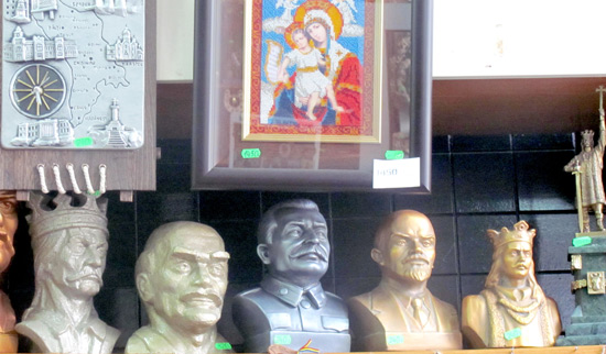 De la prosoape brodate, drapelul naţional, vase de lut, diverse statuete, portrete, insigne şi steaguri sovietice, până la busturile celor mai marcante şi controversate personalităţi istorice – toate sunt expuse aici laolaltă, iar Ştefan cel Mare îşi aşteaptă cumpărătorii stând cuminte alături de Stalin şi Lenin. Deşi iniţial cam rezervată, vânzătoarea s-a încumetat totuşi să ne spună că în topul preferinţelor moldovenilor se află bustul marelui domnitor Ştefan cel Mare şi, paradoxal, în ultimul timp – panglica Sfântului Gheorghe. Bustul lui Ştefan este procurat, de regulă, de administraţia şcolilor, de diverse instituţii de stat, întreprinderi, pentru oficii. În schimb, Lenin şi Stalin sunt căutaţi mai mult de către turiştii străini, printre aceştia figurând italieni, francezi sau americani. „Chiar şi dacă se întâmplă ca moldovenii să procure busturile lui Lenin şi Stalin sau diverse obiecte ce marchează perioada sovietică, ei le iau pentru a le trimite în străinătate. Probabil, la solicitarea cuiva sau pentru a le face cadou”, ne explică femeia. Ea recunoaşte că, periodic, printre vizitatorii magazinului se găsesc şi din acei care îi reproşează faptul că aici se vând obiecte reprezentând simbolurile sovietice, sau că bustul lui Ştefan cel Mare stă prea aproape de conducătorii sovietici de tristă faimă, departe de a fi prieteni ai poporului român. Dar… „Comerţul e comerţ, se justifică femeia, ce îmi aduce patronul – asta vând, iar el aduce ceea ce îi cer clienţii”.