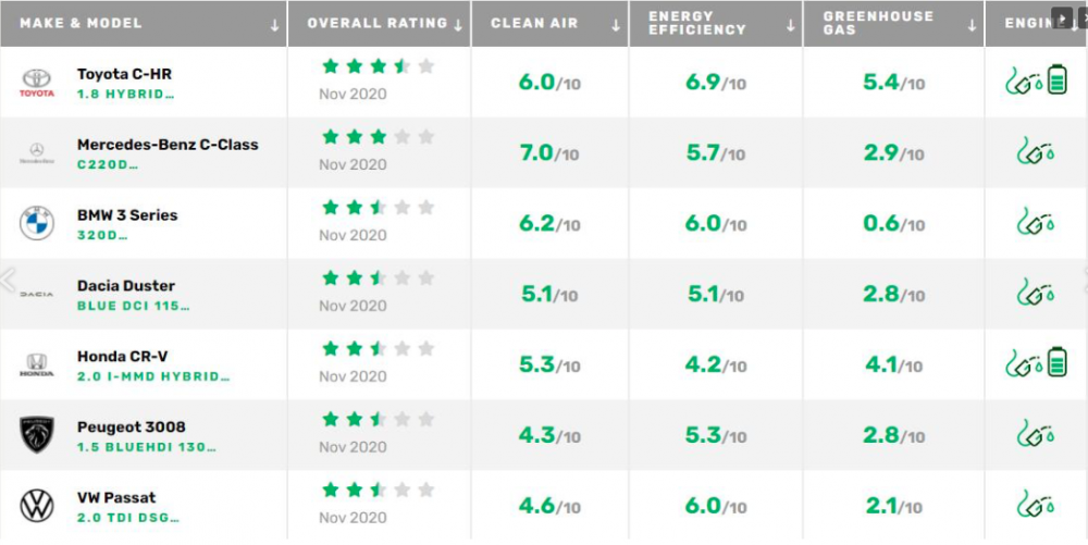 În această ordine de idei, motorul germanilor 2.0 TDI de 115 CP, dar și gama 1.5 BlueHDI de la Peugeot și Citroen, reușesc un idex de eficiență peste 7.7, in timp ce o Toyota Yaris Hybrid nu poate sa afișeze decât un index de 7.4.