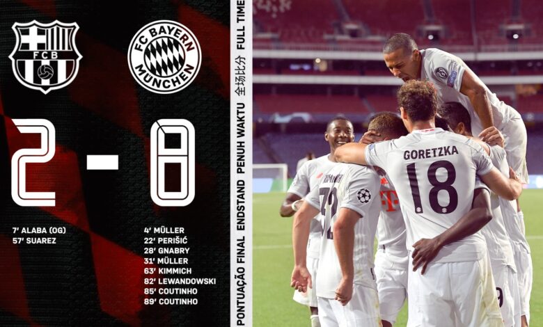 Pentru bavarezi au marcat Muller ‘4, ’31, Perisic ’22, Gnabry ’28, Kimmich ’63, Lewandowski ’82 și Coutinho ’85, ’89. Golurile catalanilor au fost înscrise de Alaba ‘7 (autogol) și Luis Suarez ’57.