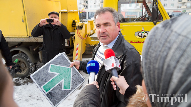 La instalarea noului semn de circulaţie pe stâlpul de semafor a participat primarul general al Chişinăulu, Dorin Chirtoacă. El a ajutat un muncitor al întreprinderii Semafor Service să înşurubeze plăcuţa pe stâlp. Pe un ger tăios, Dorin Chirtoacă s-a dovedit util la ţinutul unei chei fixe. Săgeata verde permite autoturismelor să vireze la dreapta, chiar dacă semaforul indică culoarea roşie.