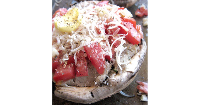 Spălați și curățați ciupercile – le scoateți codițele și le puneți separat. Ciupercile se aranjează într-o tavă de cuptor unsă cu puțin ulei. Ceapa, ardeiul și gogoșarul se curăță și se spală. Se taie toate legumele cubulețe mărunte și se pun într-o tigaie cu un pahar de apă și două linguri de ulei. Puneți pe foc, acoperiți cu capac și amestecați periodic până legumele se înmoaie foarte bine. Codițele de la ciuperci se taie mărunt și se adaugă peste legumele înmuiate bine, amestecați și mai lăsați cinci minute pe foc mediu. Brânza vegetală se taie cubulețe mici și se adaugă la legume. Verdeața se taie mărunt și se adaugă la compoziția de legume și brânză. Puneți sare după gust, amestecați bine și stingeți focul. Cu o linguriță umpleți ciupercile, le puneți la cuptor 40-50 de minute. După ce le scoateți din cuptor şi înainte de a le servi, puteţi să mai radeţi puţină brânză peste ele, cel mai bine să le serviți calde, chiar dacă și reci sunt destul de bune. Se pot servi ca fel principal de mâncare sau ca şi garnitură de legume.