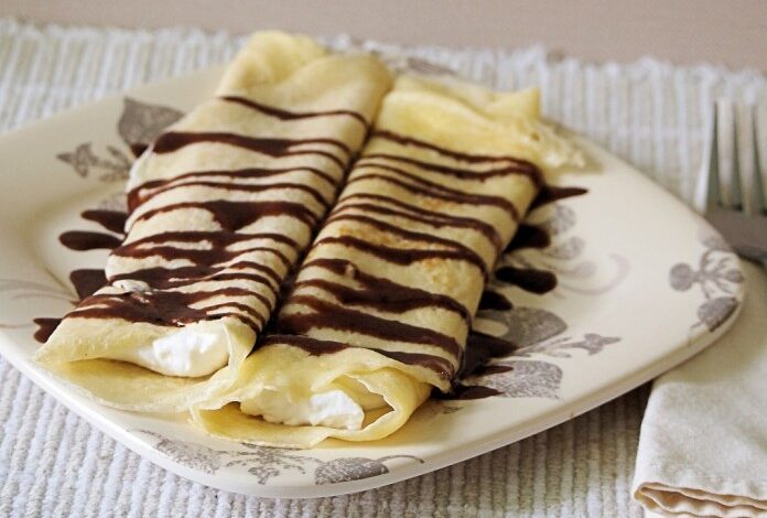 Ca să asamblezi clătitele, tot ce trebuie să faci este să pui cam 2 linguri de cremă în centrul unei clătite și să o rulezi, iar apoi să o decorezi cu frișcă și sirop de ciocolată.