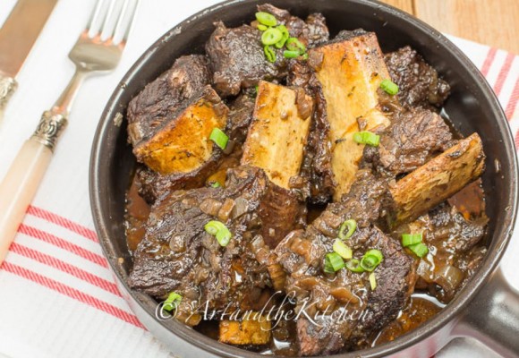 Torni vinul roşu în tigaie şi cureţi fundul vasului. Apoi, torni şi berea, supa de vită, bulionul, sosul, foaia de dafin şi cimbrul. Laşi să dea în clocot şi apoi dai la o parte de pe foc. Reaşezi coastele în tigaie, acoperi şi bagi la cuptor. Laşi la foc mediu pentru 2-3 ore.