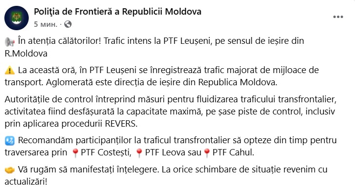 Poliția de Frontieră a Republicii Moldova anunță trafic majorat de mijloace de transport la punctul de trecere a frontierei Leușeni, pe sensul de ieșire din țară.
