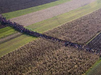 Într-o filmare realizată cu o dronă de cei de la Daily Mail, se poate observa cum mii de refugiaţi traversează, sub escorta poliţiei, un câmp din localitatea Rigonce, situată la periferia oraşului Brezice, la frontiera Sloveniei cu Croaţia.