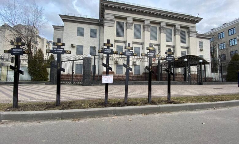 Cruci negre îngropate în fața clădirii Ambasadei Rusiei din Kiev cu inscripția „ocupant rus” și „Bine ați venit în iad”. Oficialii se grăbesc să plece