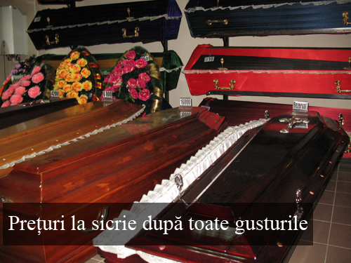 Concurentii cei mai puternici sunt cei de la „Ritual Prof”. La ei o inmormantare ajunge pana la 3000 de lei, in functie de sicriu si serviciile comandate de client. Vanzatoarea Valentina zambeste si imi spune ca, pe timp de criza, s-a micsorat pana si mortalitatea. „Vanzarile au scazut cu vreo 20%, deoarece oamenii nu au multi bani si se straduiesc sa cumpere sicrie ieftine”. Pana sa inceapa criza, cele mai solicitate sicrie erau cele din stejar la un pret intre 16.000 si 30.000 de lei.