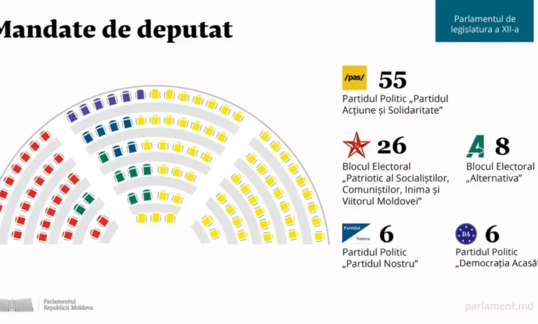 Partidul prezidențial pro-european Acţiune şi Solidaritate (PAS) a obţinut 50,20% din voturi la alegeri şi va deţine, din nou, majoritatea în Parlament. PAS va avea în noul Parlament 55 de mandate, așa-zisul bloc patriotic, dominat de comuniștii și socialiștii filoruși – 26, Blocul Alternativa (stânga declarat pro-europeană) – 8, iar formațiunea populistă Partidul Nostru şi Partidul Democraţia Acasă (promotor al reunificării cu România) – câte 6.