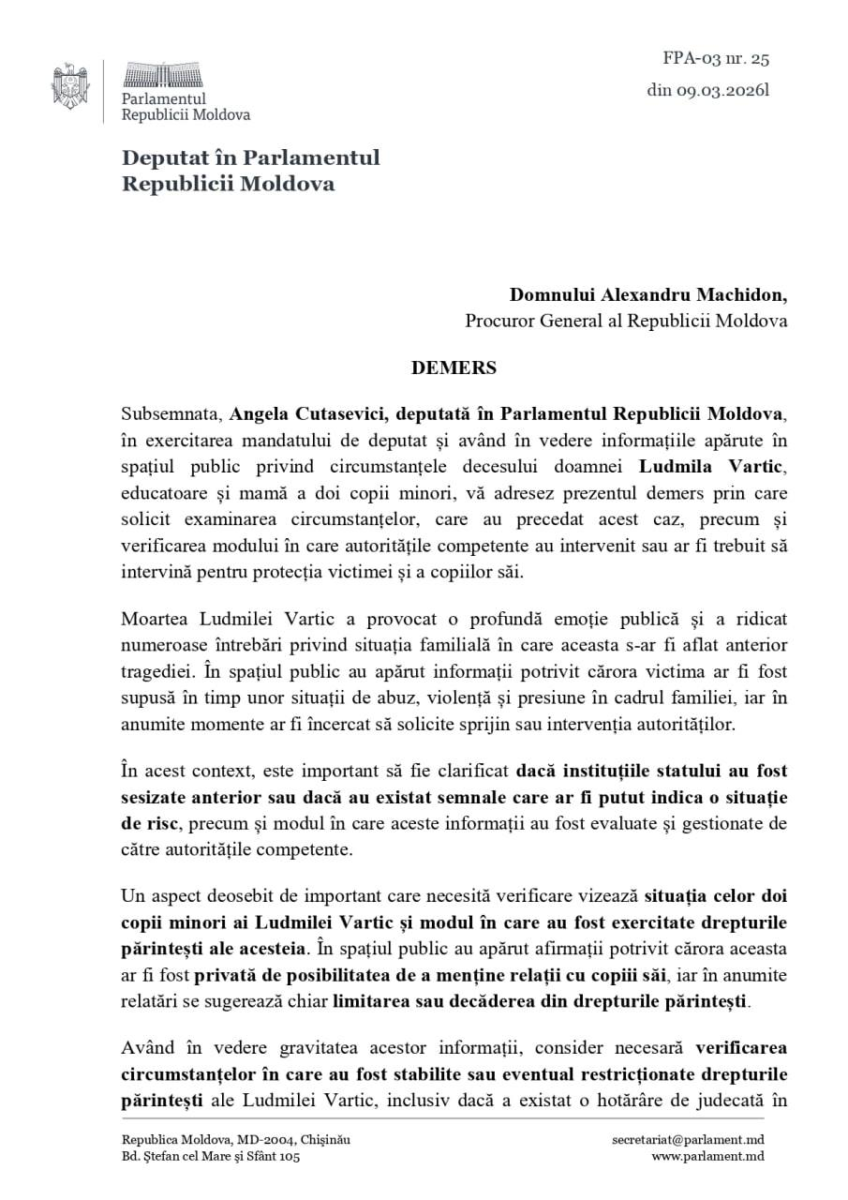 Deputata MAN, Angela Cutasevici, a înaintat un demers oficial către Procuratura Generală, prin care solicită investigarea complexă a circumstanțelor care au precedat decesul Ludmilei Vartic și verificarea modului în care au intervenit instituțiile responsabile.
