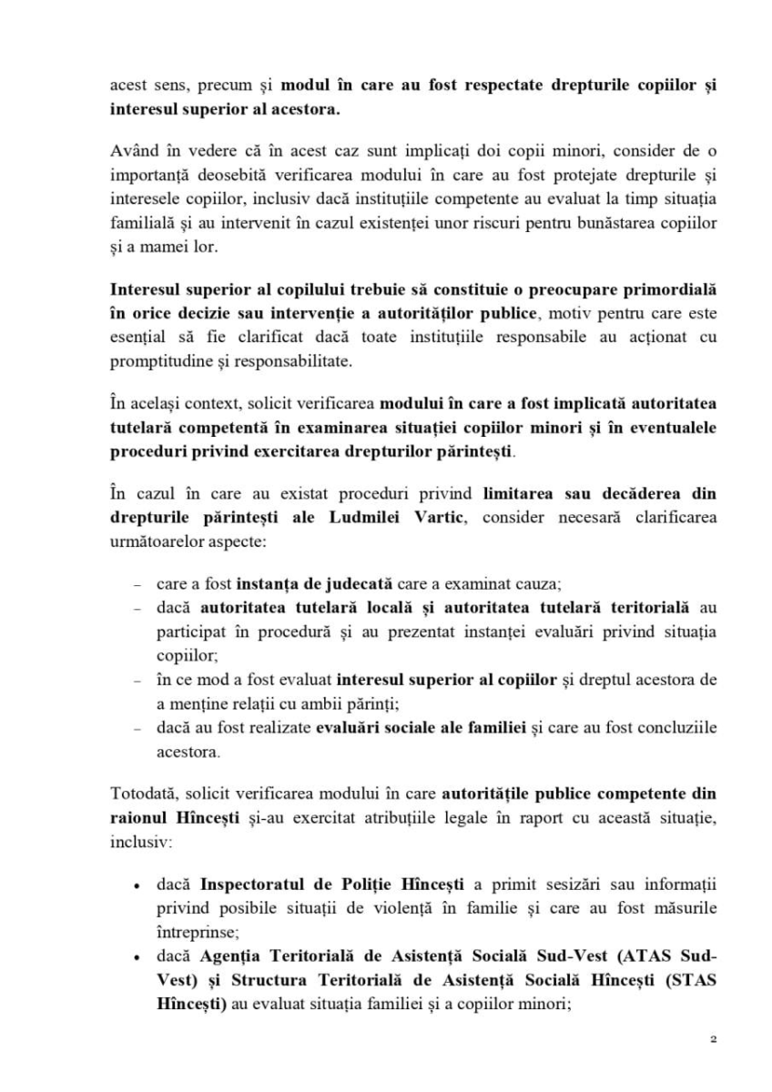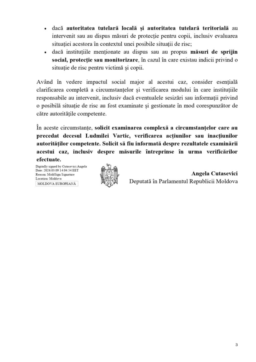 Deputata cere clarificări privind eventualele sesizări anterioare, evaluarea situației de risc în care se aflau victima și cei doi copii minori, precum și legalitatea procedurilor prin care ar fi fost restricționate drepturile părintești ale Ludmilei Vartic.