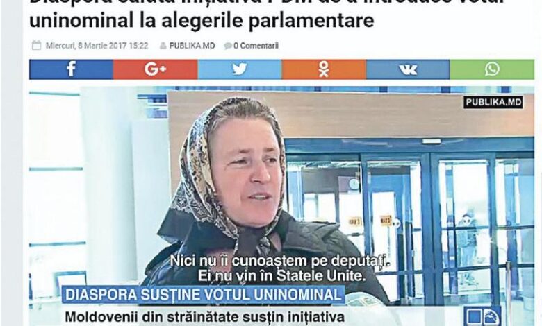 Chiar de la începutul reportajului este menţionat că „moldovenii, stabiliţi în diferite ţări, salută iniţiativa de a introduce votul uninominal la alegerile parlamentare. Astfel, în premieră, membrii diasporei vor avea posibilitatea să-şi aleagă reprezentanţii săi în Legislativ”. În reportaj mai este specificat că această iniţiativă legislativă este propusă de Vlad Plahotniuc şi că „democraţii mai vor ca cetăţenii să aibă posibilitatea de a retrage mandatul unui deputat în cazul în care acesta nu-şi respectă promisiunile”.