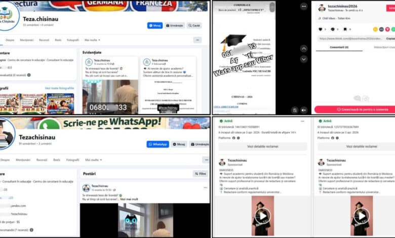 Potrivit investigației, mai multe pagini de Facebook promovau, la începutul anului 2026, servicii de „ajutor” pentru redactarea tezelor de licență și master. În paralel, au fost identificate și portaluri specializate, unele active de peste un deceniu, care oferă inclusiv servicii pentru studenți din România sau chiar redactarea tezelor de doctorat.