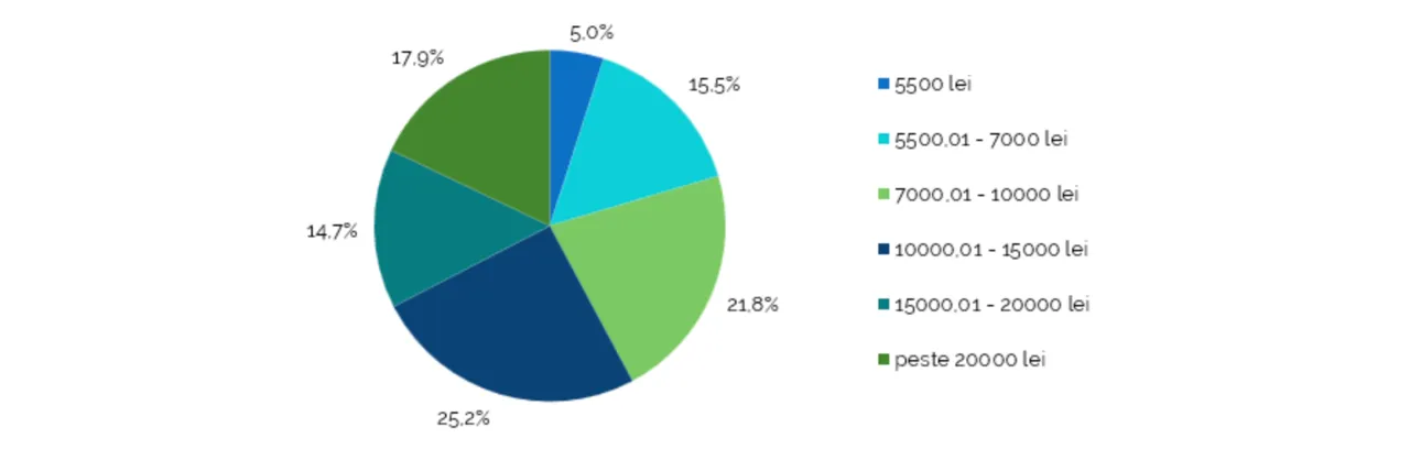 Din totalul salariaților, 5,0% au avut salarii minime (de 5.500 lei), 15,5% au avut salarii cuprinse între 5.500 și 7.000 lei, 46,9% au avut salarii cuprinse între 7.000 și 15.000 lei, iar 32,6% au avut salarii mai mari de 15.000 lei.