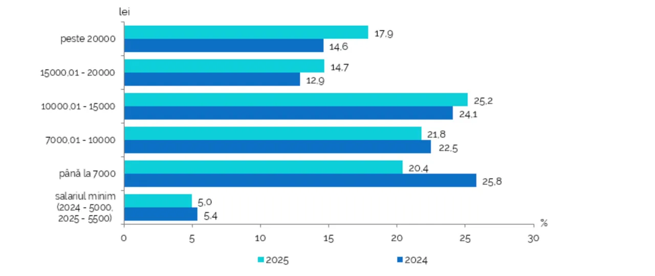 Comparativ cu luna septembrie 2024, ponderea salariaților care au avut un salariu minim stabilit în anii respectivi, s-a micșorat cu 0,4 puncte procentuale, iar ponderea salariaților cu salarii de peste 10.000 lei s-a mărit cu 6,2 puncte procentuale.