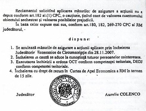 Preşedintele Curţii de Apel Economice, Aureliu Colenco, este pur şi simplu uluit de această întâmplare, pentru că anume „încheierea” sa a fost falsificată (foto 1): „Pentru prima dată văd o încheiere a instanţei falsificată. Autorul acesteia urmează neapărat să fie tras la răspundere. Asta nu e semnătura mea, iar ştampila instanţei este mai mare decât cea aplicată aici. Ştiu că procuratura a deschis o urmărire penală pe acest caz, dar va fi foarte greu de dovedit cine e vinovatul. Din câte cunosc, falsificatorii sunt aceiaşi oameni care au falsificat întreg dosarul prin care s-a încercat acapararea a 23 mln. de lei de la „Moldova-Gaz”, a adăugat magistratul.