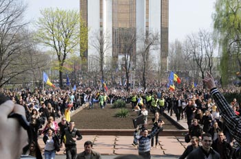 Arborarea drapelului Uniunii Europene pe sediul parlamentului, in timpul protestelor din 7 aprilie, a fost negociata de prim-vicepresedintele parlamentului, Vladimir ?urcan. El a declarat ca a facut acest lucru „pentru a linisti masele”.