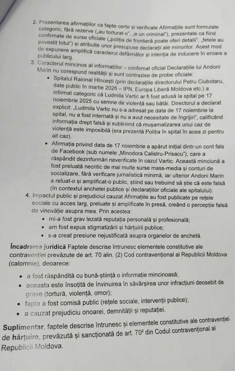În plângere se mai arată că informațiile ar fi fost contrazise de declarații oficiale ale Spitalului Raional Hâncești. Potrivit directorului instituției, Ludmila Vartic nu s-ar fi adresat la spital pe 17 noiembrie 2025, nu a fost internată și nu a avut nevoie de îngrijiri medicale, iar informațiile privind o presupusă agresiune ar fi fost calificate drept false.