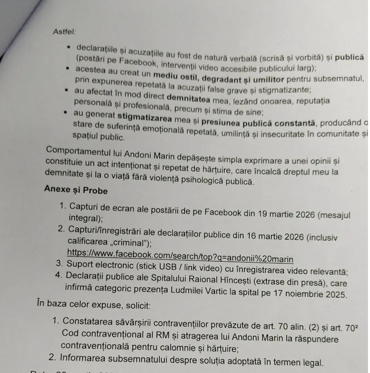 În plângere se solicită constatarea săvârșirii contravențiilor prevăzute de articolul 70 alineatul (2) din Codul contravențional al Republicii Moldova (calomnie) și de articolul 70² (hărțuire), precum și atragerea lui Marin Andoni la răspundere contravențională.