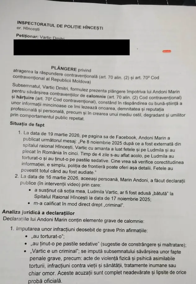Plângerea a fost depusă la Inspectoratul de Poliție Hâncești la data de 20 martie 2026.