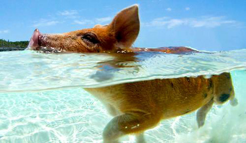 Animalele se răsfaţă zilnic sub razele soarelui şi se răcoresc cu băi în apa cristalină, după cum se vede şi din fotografiile care ilustrează cartea. Pozele au fost realizate de Jim Abernethy. „Ori de cate ori arăt aceste poze cuiva, rămâne uimit. Porcii trăiesc într-o armonie perfectă în insula lor din paradis. În mod surprinzător, ei sunt foarte buni înotători. Chiar şi porcii mici se simt perfect în apă. Nu îi deranjează deloc dacă înoată alături de oameni”, spune fotograful de 53 de ani.