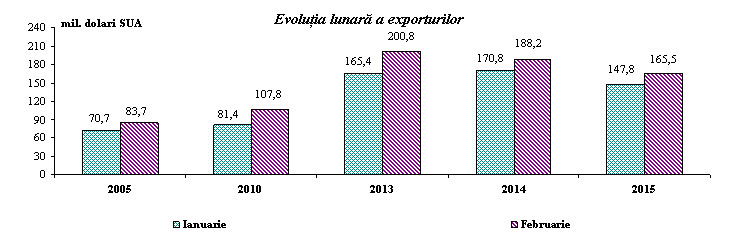 În ianuarie-februarie 2015 exporturile de mărfuri au totalizat 313,3 mil. dolari SUA, volum inferior celui realizat în perioada similară din anul 2014 cu 12,7%.