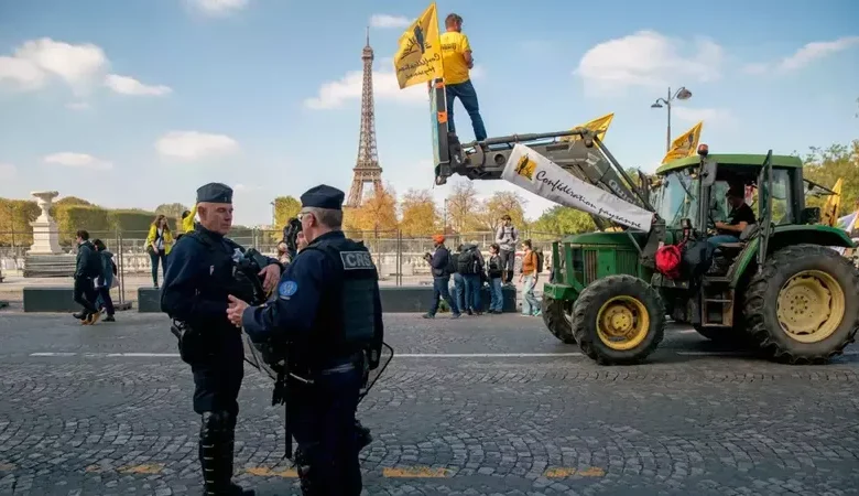 La Paris, fermierii au venit cu tractoarele până în faţa Turnului Eiffel şi a monumentului Hotel des Invalides pentru a protesta faţă acordul de liber schimb cu țări din america de sud.