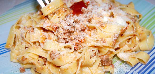 Porţii pentru patru persoane: se căleşte ceapa în ulei de măsline până devine cristalină, se adaugă usturoiul pisat până se rumeneşte, morcovul şi ţelina dată pe răzătoare, mai apoi cărniţa tocată se toarnă peste ceapă şi legume lăsându-se la călit până când devine albicioasă, între timp s-au tocat roşiile şi se adaugă peste compoziţia din cratiţă, se amestecă bine pentru a nu se prinde şi când roşiile încep să lase un strop de suc se toarnă şi pasta de roşii amestecându-se continuu timp de aproximativ 30 de minute. La acest fel de sos eu folosesc: sare, piper, coriandru proaspăt tocat, cimbru proaspăt tocat, rozmarin uscat şi provence.
