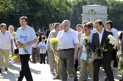 Primul a aparut la monument Vladimir Voronin, insotit de angajatii presedintiei, cam pe la 8.15. Au depus flori si, in cinci minute, au si disparut. O ora mai tarziu, scuarul s-a umplut de lume, care a venit la Marele Stefan cu flori, cantec si o vorba buna. Dupa ce au cantat impreuna „La moartea lui Stefan Voda", alaturandu-si vocile la ansamblul folcloric „Plaiesii”, condus de Nicolae Gribincea, oamenii le-au facut loc in cercul lor, oficialilor, scriitorilor, poetilor, pentru a rosti discursuri dedicate evenimentului. Vlad Filat, presedintele PLDM, a declarat ca a venit la monument ca sa-si arate dragostea fata de tara. „Daca astazi ar fi fost Stefan, Moldova nu ar fi avut astfel de conducere”, a concluzionat politicianul. La randul sau, Mihai Ghimpu, presedinte PL, a amintit cuvintele lui Stefan cel Mare: „Moldova nu e a mea, ci a urmasilor, urmasilor nostri”, pe care, potrivit lui Ghimpu, conducatorii de astazi nu ar trebui sa le uite. Presedintele AMN, Serafim Urecheanu, a mentionat ca, „daca ar fi posibil, l-ar indemna pe Stefan sa vina acasa macar pentru doua zile, ca e mare pacoste de la Voronin”.