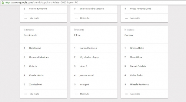 Topurile realizate de Google România cuprind rezultatele agregate din două tipuri de liste de căutări: căutări în trend (acestea sunt căutările care au înregistrat cea mai mare creștere de trafic în 2015, în comparație cu 2014) și cele mai căutate (în această listă se regăsesc termeni care au înregistrat cel mai mare volum de căutări în 2015).
