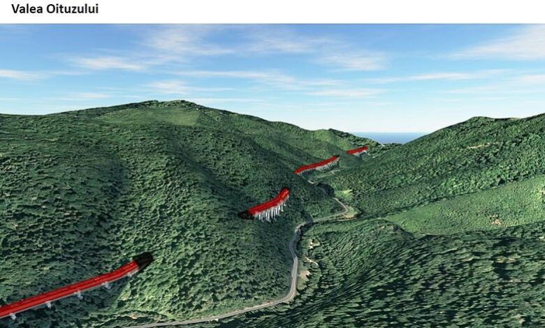 Imagine cu o simulare 3D a autostrăzii A13 pe Valea Oituzului: viaducte și tuneluri.