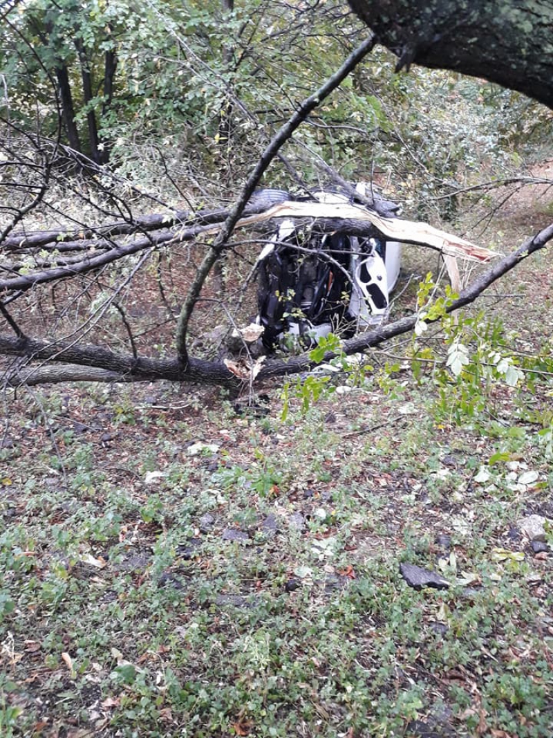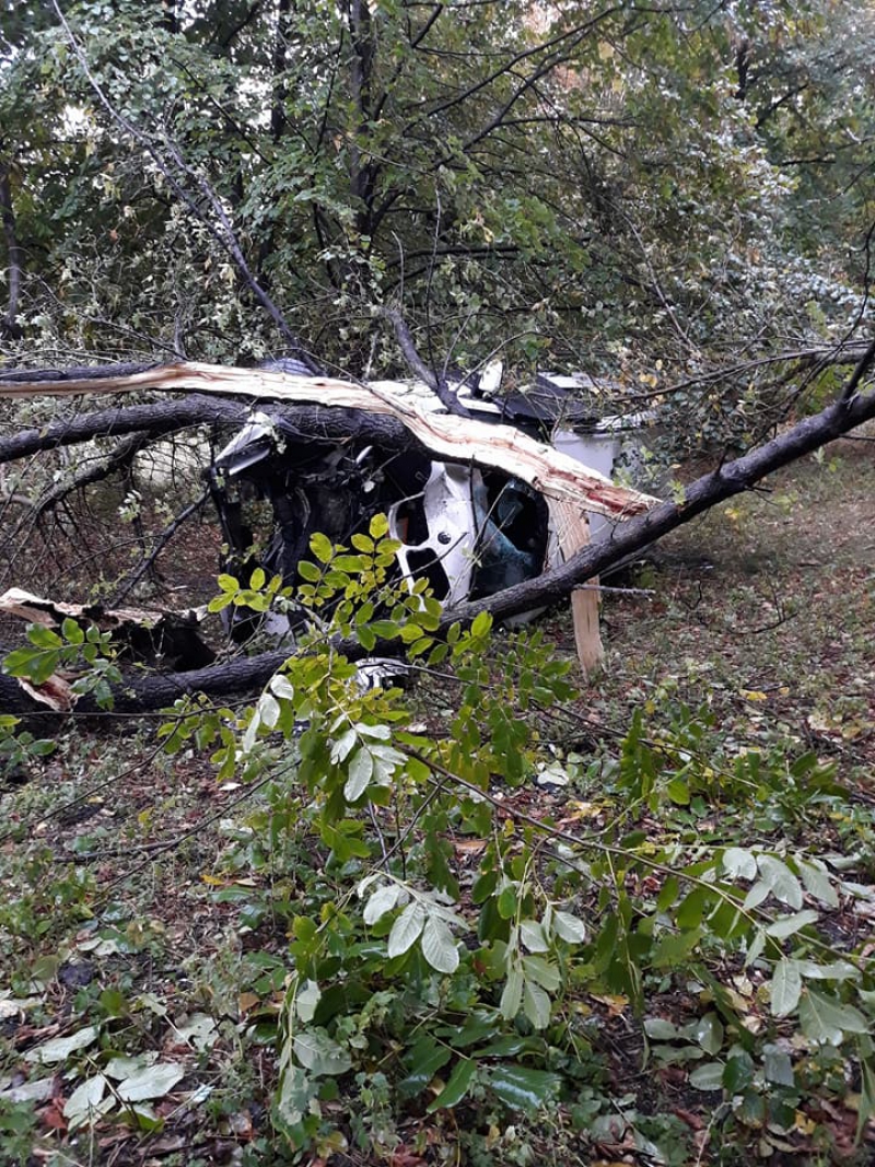 FOTO / Un BMW, DISTRUS după ce s-a rostogolit de câteva ori și a ajuns într-un copac