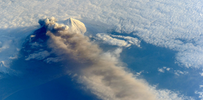 Erupția vulcanului Pavlov a început pe 13 mai. Norul de cenușă aruncat a ajuns la o înălțime de șase mii de metri. Din cosmos se vede dâra de fum cenușie ce se întinde deasupra norilor albi. Vulcanul se află pe una din insulele arhipelagului Aleutine din nordul Oceanului Pacific.