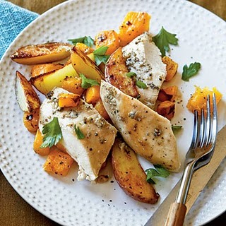 Amestecati 1 1 / 2 linguri de usturoi, 1 / 2 lingurita sare, 1 / 2 lingurita piper, si salvie într-un castron mic. Spalati puiul si slăbiţi pielea de pe piept şi copane (desfacand pielea cu degetele, împingând uşor între piele şi carne). Ridicaţi extremităţile aripilor şi copanelor pe spate. Frecaţi puiul sub piele cu amestec-ul de usturoi. Asezati puiul in tava cu pieptul in sus si stropiti cu ulei. Introduceti tava in cuptorul incins in prealabil si lasati asa timp de 20 de minute. Intre timp spalati cartofii curatati si taiatii felii si amestecatii cu unt, 1 1 / 2 lingurite usturoi, 1 / 2 linguriţă de sare şi 1 / 4 lingurita piper. Aranjaţi în jurul pui-ului in cuptor. Coaceţi timp de 1 oră sau până când vedeti ca pielea s-a rumenit bine. Cand totul este gata, opriti focul si mai lasati tava in cuptor aproximativ 10 minute.
