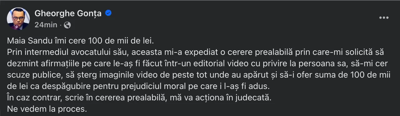 „Maia Sandu îmi cere 100.000 de lei. În caz contrar, mă va acționa în judecată. Ne vedem la proces”, a scris Gonța pe rețelele sociale.
