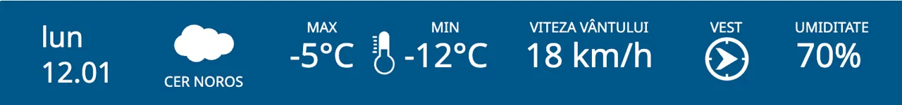 Meteorologii prognozează pentru luni, 12 ianuarie, cer noros pe întreg teritoriul R. Moldova, iar maximele termice vor fi cuprinse între -12 și -2 grade Celsius.