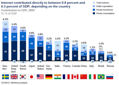 De asemenea, raportul arată că internetul generează 3,4% din PIB-ul celor 13 ţări (6% în Suedia şi UK), procent mai mare decât agricultură (2,2%) sau sectorul educaţional (3%). Respectiv, se estimează că, la nivel mondial, internetul generează o valoare adăugată de 1.672 miliarde dolari, respectiv 2,9% din PIB.