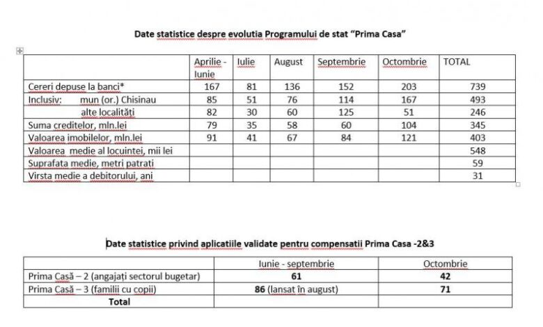 Amintim că programul „Prima Casă”, lansat de Guvern, este destinat persoanelor cu vârsta de până la 45 de ani, care sunt angajate oficial şi nu au alte credite ipotecare. Statul garantează 50 la sută din împrumut. Preţul locuinţei nu trebuie să depăşească un milion de lei. De „Prima Casă 2” pot beneficia bugetarii, iar programul „Prima Casă 3” este destinat familiilor care au copii și statul le va compensa între 25 și 100% din suma creditului, în funcție de numărul copiilor.